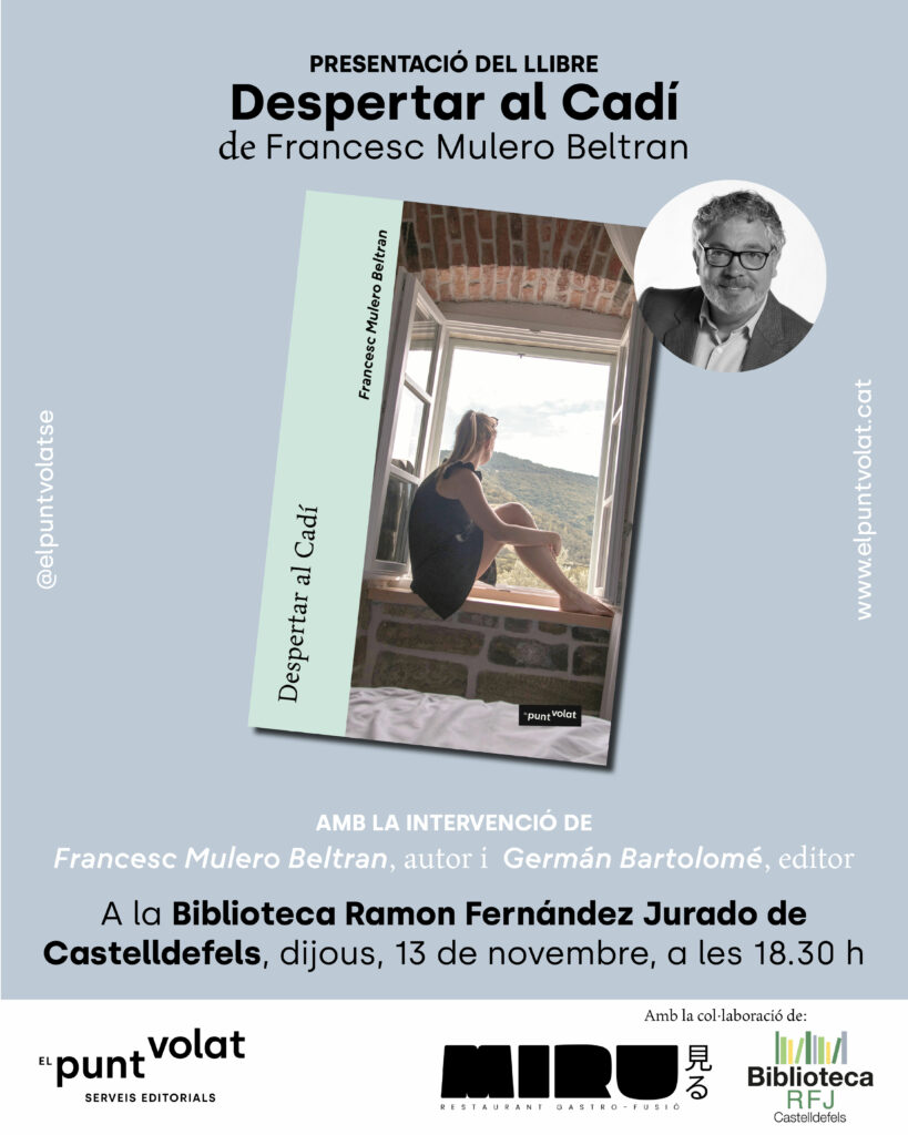 Tinc el plaer de convidar-vos a la presentació oficial de “Despertar al Cadí”, que tindrà lloc el dijous 13 de novembre a la Biblioteca Fernández Jurado de Castelldefels. Passarem una bona estona en bona companyia. Us hi espero a tots i totes!